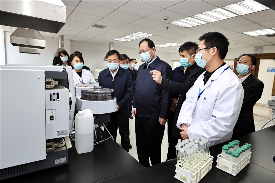 毛偉明來(lái)到省糧油產(chǎn)品質(zhì)量檢測中心察看糧油產(chǎn)品質(zhì)量檢查情況。