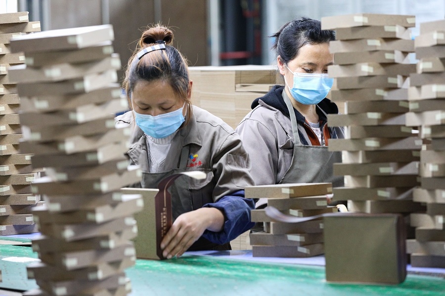4月22日,湘西經(jīng)濟開(kāi)發(fā)區三湘印務(wù)有限責任公司,工人在有序加工包裝盒。近段時(shí)間以來(lái),當地相關(guān)部門(mén)在做好新冠肺炎疫情防控的同時(shí),積極協(xié)調解決資金、招工、物流等問(wèn)題,扶持扶貧車(chē)間全面復工復產(chǎn),幫助貧困戶(hù)穩就業(yè)、穩增收。
