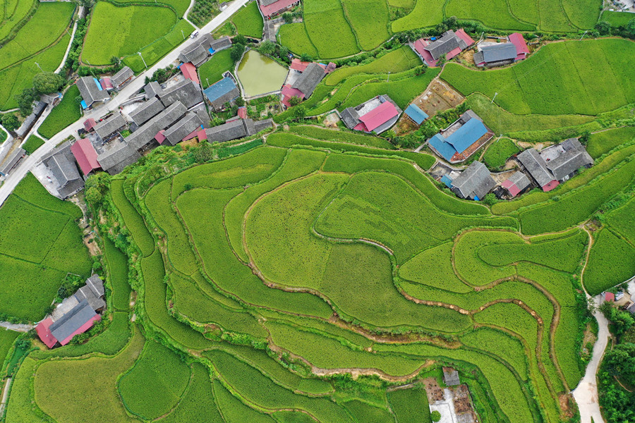 8月9日,三道坑鎮五郎溪村,初秋的梯田與村舍相互輝映,組成一幅美麗的鄉村畫(huà)卷。