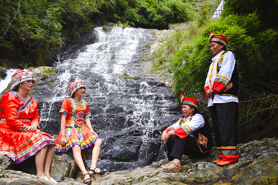 8月17日,溆浦縣小橫垅鄉羅子山村白水瀑布群下,瑤家阿哥阿妹對唱山歌。