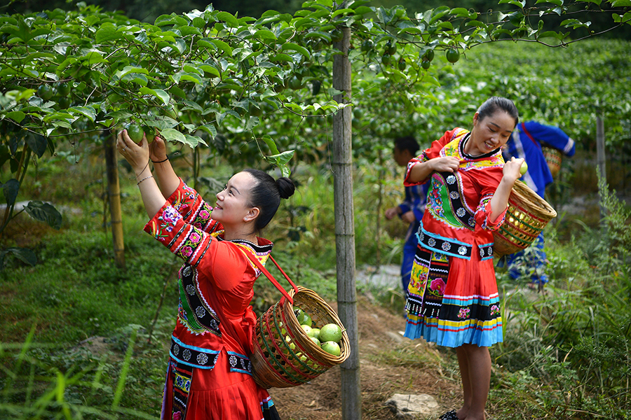 8月15日,城步苗族自治縣汀坪鄉龍塘村,村民在種植基地采摘百香果。