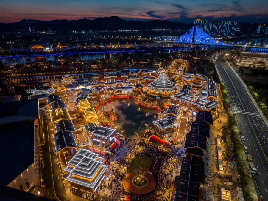 9月16日晚,游客在懷化市榆樹(shù)灣文旅商綜合體游玩。當天,該項目正式開(kāi)街。湖南日報全媒體記者 傅聰 童臻熙 鄒尚奇 攝影報道