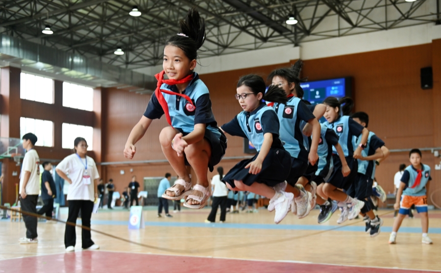 9月18日,洞口縣花古街道芙蓉學(xué)校,學(xué)生在跳繩。當天,該縣舉行中小學(xué)生跳繩比賽,31支代表隊710名學(xué)生參賽。 滕治中 攝(湖南圖片庫)