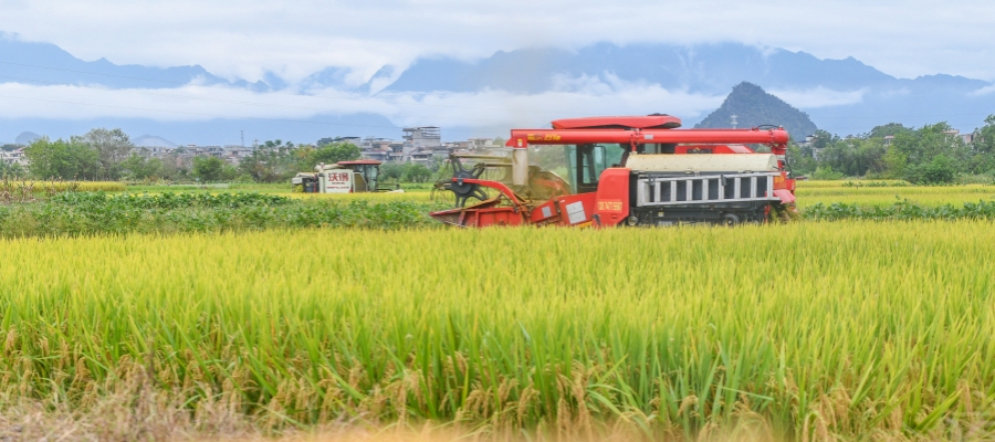 9月22日,道縣清塘鎮達村,農機手駕駛農機收割水稻。秋分臨近,當地農民搶抓農時(shí)開(kāi)展秋收,田間一派繁忙。 蔣克青 攝(湖南圖片庫)