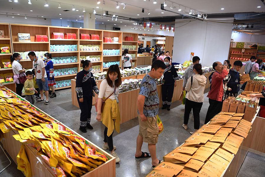 5月8日,鳳凰縣廖家橋鎮周生堂生物科技有限公司,游客在產(chǎn)品展示中心選購農特產(chǎn)品。近年,菖蒲塘村為拓寬銷(xiāo)售市場(chǎng),與民營(yíng)企業(yè)周生堂公司實(shí)施村企聯(lián)建,對村里的蜜柚、獼猴桃等農產(chǎn)品實(shí)行保底收購,并以“菖蒲塘”品牌入股公司,占股5%,壯大了村集體經(jīng)濟,同時(shí)安排了160多名村民就業(yè)。