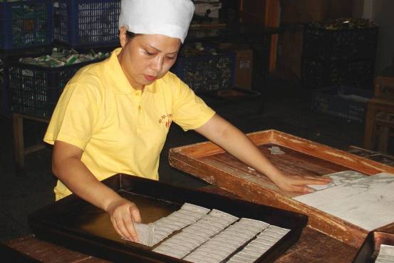 麻香糕在本地又叫“麻煩糕”,制作工藝程序復雜,分段明確,需十六道主要工序,它制作的工藝涵蓋了廣西云片糕、湘潭燈芯糕、武漢麻烘糕,合川桃片等各種名糕工藝,而且前后工藝都有創(chuàng )造性工藝,制作時(shí)需依四季變化不斷調節配方,才能達到要求。