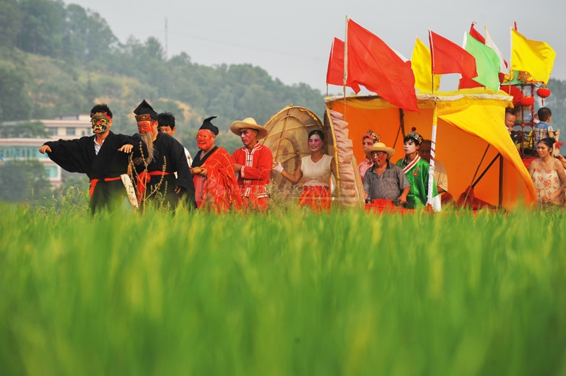 珠梅“抬故事”是出現在湘中地區的一項頗有影響的民間活動(dòng)。地處湖南省漣源市龍塘鄉。明崇禎年間,當時(shí)道教已傳入安化(現漣源市)各地,珠梅“西元山觀(guān)”是最早建立的道教寺觀(guān)之一,在當時(shí)戰亂、民不聊生的情況下,人們祈求祛病消災,以道教齋醮形式,許愿“抬故事”,以了人們的心愿,如此“抬故事”的活動(dòng)就逐漸得到發(fā)展,延續幾十代而發(fā)展至今。改革開(kāi)放以后,逐漸推陳出新,既保持了古俗風(fēng)貌,又創(chuàng )立了一些新的形式,從而逐步演變成了揚善懲惡的一種群眾性自?shī)饰幕顒?dòng)。它取材于神話(huà)傳說(shuō),歷史故事和現實(shí)生活,一臺故事一個(gè)人物,表達一個(gè)故事史實(shí),反映人們一種期望?!肮适隆毙问蕉鄻?,既有原始型的,又有現代型的,如:“東吳成親”、“紅色娘子軍”、“農家樂(lè )”等還有“揪千故事”,“盤(pán)故事”、“船故事”、“馬故事”、“夜故事”等。它以形象達意、流動(dòng)表意,被人們稱(chēng)為“流動(dòng)舞臺”。其中高低樁的每臺故事一個(gè)座臺,一米見(jiàn)方,高約0.8米,紅布鋪蓋,支有包裝精致的鐵架,整高丈余。故事臺架的最上層稱(chēng)之為“太子”,由一歲左右的幼兒扮演。中層稱(chēng)之“臣子”,由10歲左右的兒童少年扮演,化戲劇人物妝,站立于座臺上。座臺的前后是四名抬杠的,兩邊跟隨兩名持長(cháng)叉的武士。一臺故事,三層人物,年齡懸殊,形態(tài)各異,化妝不拘一格,濃淡相宜,相映成趣,各種不同形式的故事。
