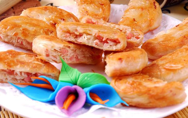 原料:每20個(gè)蘿卜絲餅需水調面300克、油酥面200克、白蘿卜750克、熟火腿100克、金鉤50克、鮮豬肉100克,味精、食鹽、蔥白、青蒜梗、醬油、麻油、胡椒粉各適量,植物油1000克(實(shí)耗100克)。制法:白蘿卜洗凈去皮,切成絲,用鹽腌一下,擠干水份;鮮豬肉洗凈剁成肉泥,金鉤浸發(fā)剁末,熟火腿切末,蔥白切花,青蒜梗切絲。以上各料與籮卜絲合在一起,再加入味精、醬油、麻油、胡椒粉等拌勻成餡,分成若干份;將水調面和油酥面各分成20個(gè)劑子,先將水調面劑子按扁,包入油酥面劑子,再按扁,用檊面棍檊成長(cháng)皮,由一頭卷成筒,再檊成長(cháng)皮,再由一頭卷成筒,然后豎著(zhù)檊成園皮,放入一份蘿卜餡,先包成球形,再按成鼓形,入沸油鍋中炸成金黃色時(shí)出鍋即成。