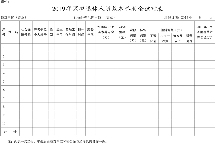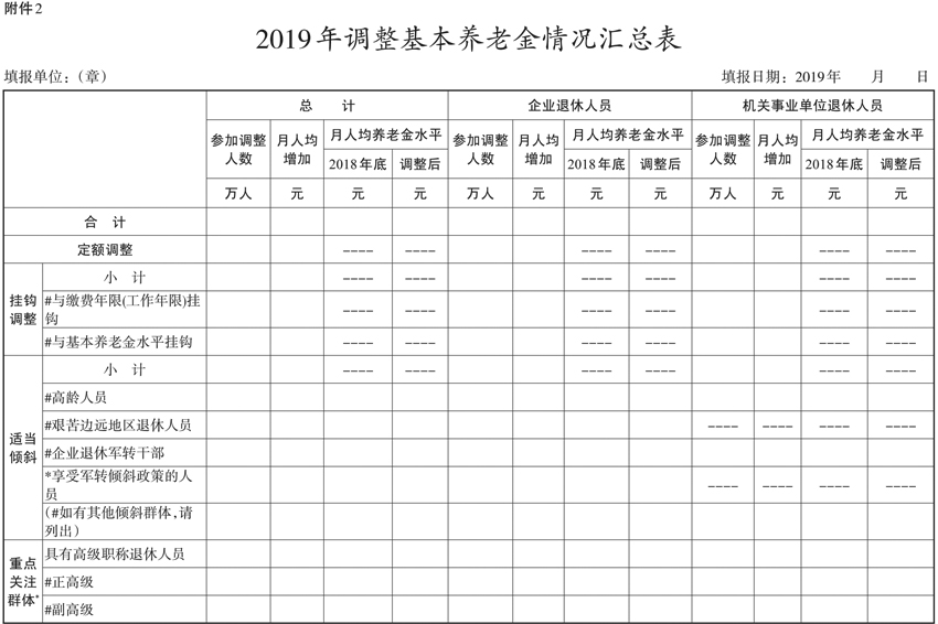 ?。ǘ┩诵萑藛T調整基本養老金的工作,各地應抓緊在2019年7月31日以前完成,并于2019年8月31日前將本地區的《2019年調整退休人員基本養老金情況匯總表》(附件2)和總結報告上報省人力資源社會(huì )保障廳、省財政廳。