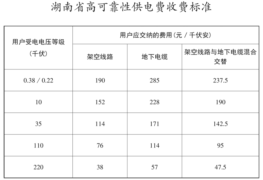 1.電力接入工程由供電企業(yè)投資建設至用戶(hù)建筑區劃紅線(xiàn)的專(zhuān)變項目,按以下標準收取高可靠性供電費:采用架空線(xiàn)路的,0.38/0.22千伏收費標準為190元/千伏安;10千伏為152元/千伏安;35千伏、110千伏、220千伏分別為114元、76元、38元/千伏安;地下電纜按架空線(xiàn)路標準的1.5倍計收;架空和電纜線(xiàn)路交替混合的,按架空線(xiàn)路的1.25倍計收。具體收費標準詳見(jiàn)附件。
