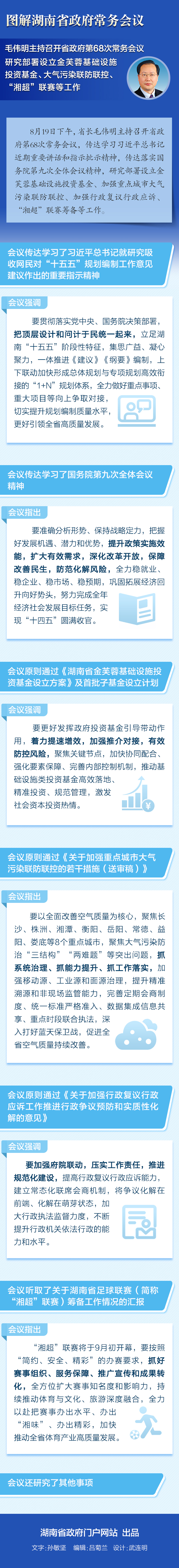 【圖解】8月19日省政府常務(wù)會(huì )議:研究設立金芙蓉基礎設施投資基金、大氣污染聯(lián)防聯(lián)控、“湘超”聯(lián)賽等