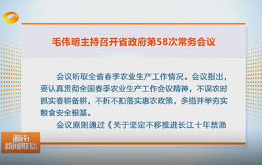 4月8日下午,省長(cháng)毛偉明主持召開(kāi)省政府第58次常務(wù)會(huì )議,傳達學(xué)習習近平總書(shū)記近期重要講話(huà)和指示批示精神,研究部署春季農業(yè)生產(chǎn)、推進(jìn)長(cháng)江十年禁漁、高速公路網(wǎng)規劃、大氣污染防治、試點(diǎn)引領(lǐng)新型城鎮化戰略、省政府立法計劃等工作。[詳細內容]