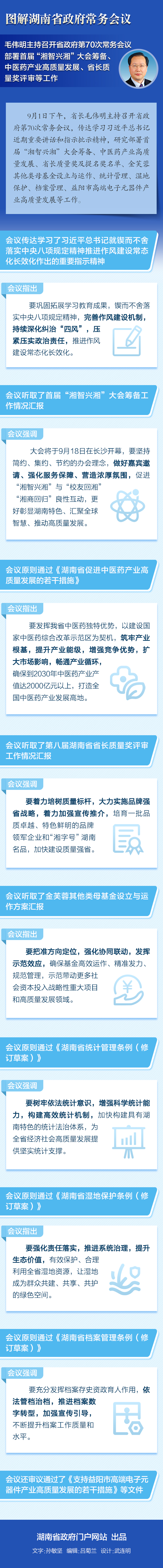 【圖解】9月1日省政府常務(wù)會(huì )議:部署首屆“湘智興湘”大會(huì )籌備、中醫藥產(chǎn)業(yè)高質(zhì)量發(fā)展、省長(cháng)質(zhì)量獎評審等工作