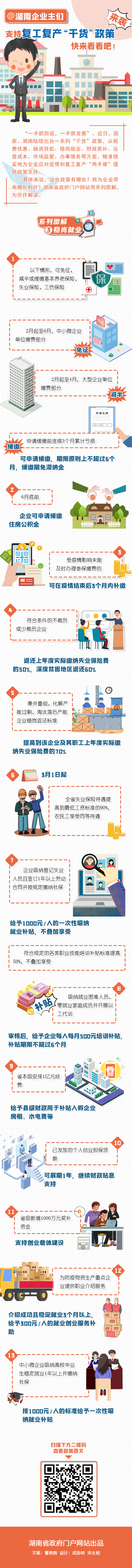 “一手抓防疫,一手抓發(fā)展”。近日,國家、湖南陸續出臺一系列“干貨”政策,從稅費優(yōu)惠、融資貸款、穩崗就業(yè)、財政獎補、運營(yíng)成本、市場(chǎng)監管、辦事服務(wù)等方面,精準穩妥地為企業(yè)應對疫情和復工復產(chǎn)“兩手硬”提供政策支持。
