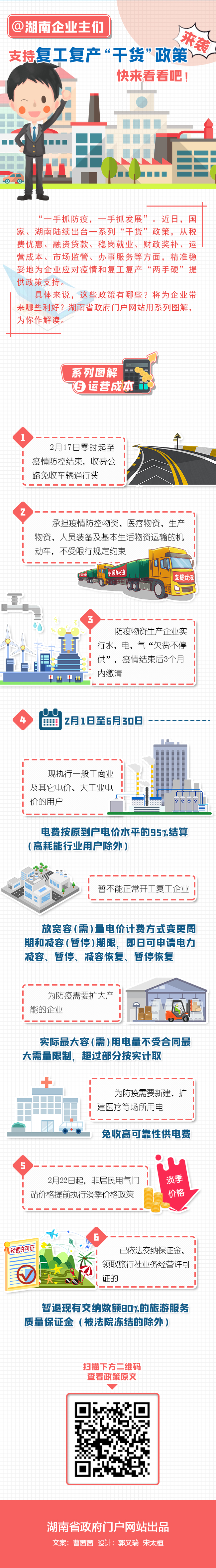“一手抓防疫,一手抓發(fā)展”。近日,國家、湖南陸續出臺一系列“干貨”政策,從稅費優(yōu)惠、融資貸款、穩崗就業(yè)、財政獎補、運營(yíng)成本、市場(chǎng)監管、辦事服務(wù)等方面,精準穩妥地為企業(yè)應對疫情和復工復產(chǎn)“兩手硬”提供政策支持。