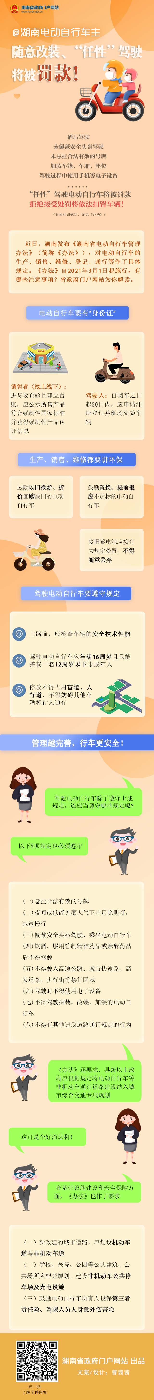 近日,湖南發(fā)布《湖南省電動(dòng)自行車(chē)管理辦法》(以下簡(jiǎn)稱(chēng)《辦法》),對電動(dòng)自行車(chē)的生產(chǎn)、銷(xiāo)售、維修、登記、通行等作了具體規定?!掇k法》自2021年3月1日起施行,有哪些注意事項?省政府門(mén)戶(hù)網(wǎng)站為你解讀。