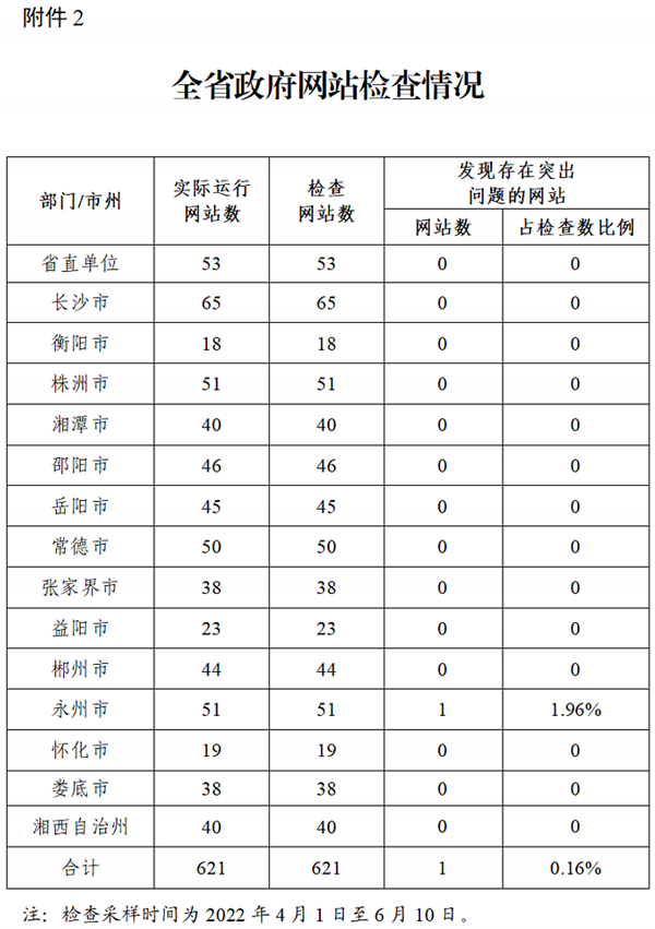 2022年第二季度,省政務(wù)局組織對全省正常運行的621家政府網(wǎng)站進(jìn)行了全覆蓋檢查,發(fā)現1家存在單項否決問(wèn)題,總體合格率99.84%。模擬用戶(hù)提問(wèn)檢查了全省136家政府門(mén)戶(hù)網(wǎng)站互動(dòng)交流功能,共有69家政府門(mén)戶(hù)網(wǎng)站實(shí)現對簡(jiǎn)單常見(jiàn)咨詢(xún)問(wèn)題1個(gè)工作日內準確答復(詳見(jiàn)附件1)。對全省正常運行的2405家政務(wù)新媒體進(jìn)行了普查,發(fā)現8家存在突出問(wèn)題,總體合格率99.67%。長(cháng)沙市、株洲市、湘潭市、邵陽(yáng)市、岳陽(yáng)市、常德市、張家界市、郴州市、懷化市、婁底市、湘西自治州政府網(wǎng)站和政務(wù)新媒體檢查合格率均達到100%。