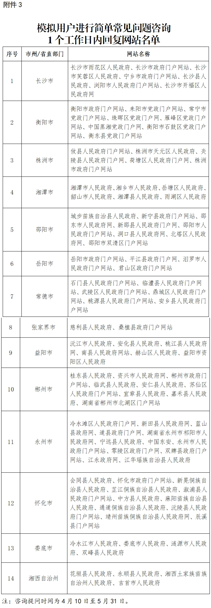 ?。ǘ┱W(wǎng)站互動(dòng)渠道應用成效仍需提升。部分政府網(wǎng)站對網(wǎng)民簡(jiǎn)單常見(jiàn)問(wèn)題咨詢(xún)回復不及時(shí),醴陵市人民政府、隆回縣政府門(mén)戶(hù)網(wǎng)站、綏寧縣政府門(mén)戶(hù)網(wǎng)站、武岡市政府門(mén)戶(hù)網(wǎng)站、大祥區人民政府網(wǎng)、常德市人民政府門(mén)戶(hù)網(wǎng)站、澧縣人民政府門(mén)戶(hù)網(wǎng)站、桂陽(yáng)縣政府門(mén)戶(hù)網(wǎng)站8家網(wǎng)站對網(wǎng)民簡(jiǎn)單常見(jiàn)咨詢(xún)問(wèn)題5個(gè)工作日內未回復。個(gè)別網(wǎng)站未充分利用政府網(wǎng)站互動(dòng)交流渠道開(kāi)展調查征集,省文物局網(wǎng)站未提供在線(xiàn)調查征集渠道,省國資委、張家界市武陵源區等網(wǎng)站監測時(shí)間點(diǎn)前1年內開(kāi)展的調查征集活動(dòng)結束后1個(gè)月內未公開(kāi)反饋結果。