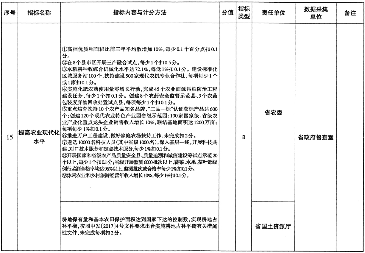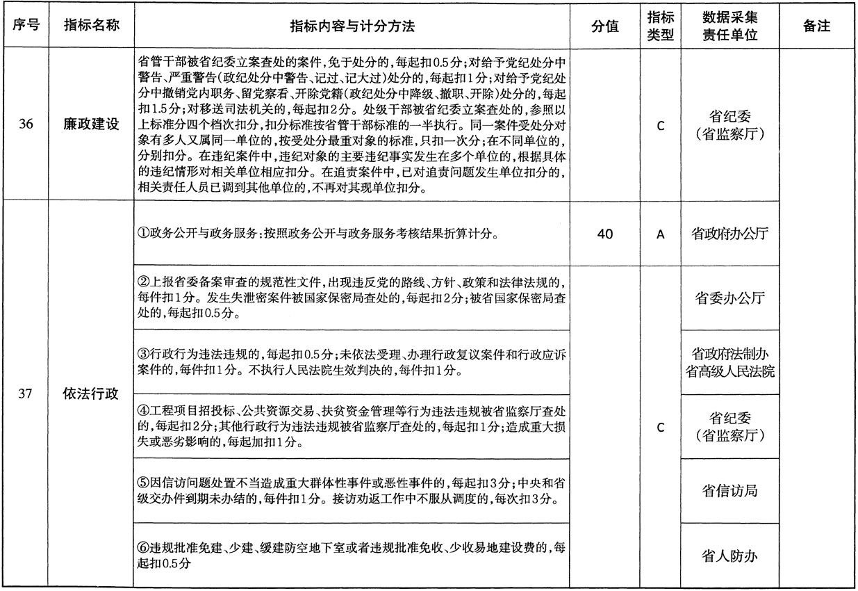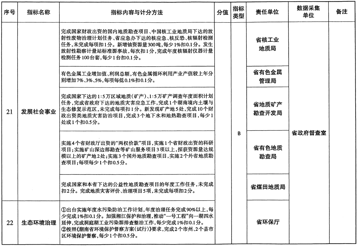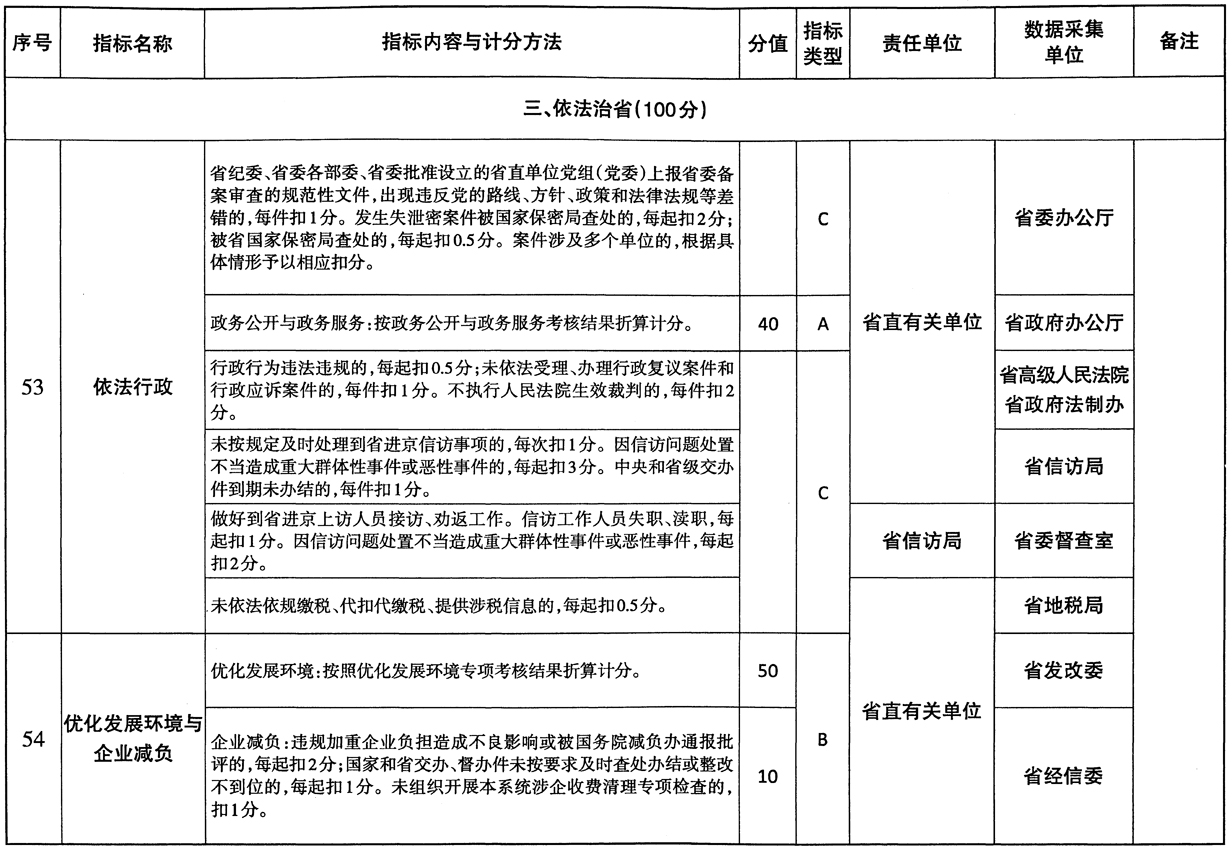 (一)評估內容。主要評估各地各部門(mén)貫徹黨中央、國務(wù)院和省委、省人民政府決策部署、履行法定職責的情況,特別是落實(shí)省第十一次黨代會(huì )精神、省委常委會(huì )作出的重大決策部署以及《省政府工作報告》明確的重點(diǎn)工作任務(wù)情況。