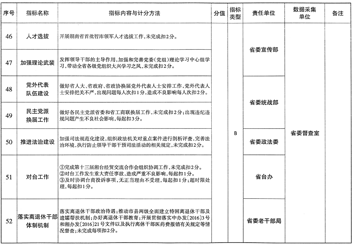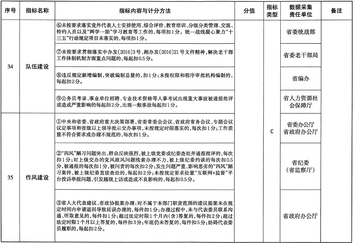 1.數據采集。2018年1月15日前,各地各部門(mén)將本地本部門(mén)指標任務(wù)完成情況(含數據采集責任單位明確應提供的佐證資料)上傳至湖南績(jì)效管理信息平臺。省直數據采集責任單位根據平時(shí)掌握的情況和各地各部門(mén)的自評結果及佐證材料,對指標任務(wù)完成情況進(jìn)行考核驗收與評分,并于2018年1月20日前,將評分數據和扣分事項詳細說(shuō)明通過(guò)湖南績(jì)效管理信息平臺報送至省績(jì)效辦。納入評估范圍的專(zhuān)項考核(如脫貧攻堅等),必須體現省委、省人民政府對績(jì)效評估的原則要求,突出考核重點(diǎn),體現結果導向,考核內容不重復,不交叉,考核辦法和指標須報省績(jì)效評估委員會(huì )統籌協(xié)調和審核把關(guān)后方能印發(fā)實(shí)施,年終考評時(shí)須按單位分類(lèi)提供差異化考核結果。按照“誰(shuí)采集、誰(shuí)負責”的要求,各數據采集責任單位在數據采集過(guò)程中應堅持“以事實(shí)為依據,以規則為準繩”,做到公道正派、敢于擔當。評分數據和扣分事項報省績(jì)效辦前,應聽(tīng)取各有關(guān)單位意見(jiàn),保證數據的準確性和公正性。
