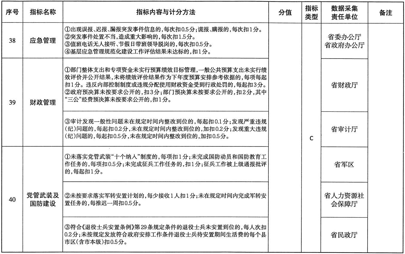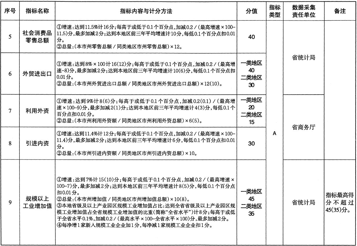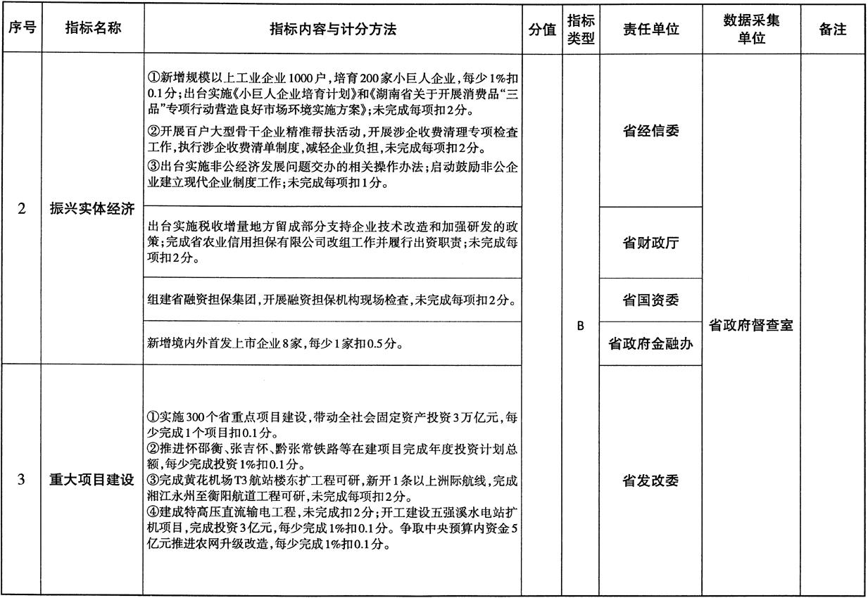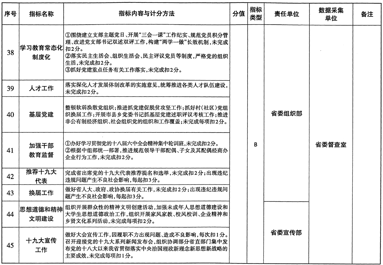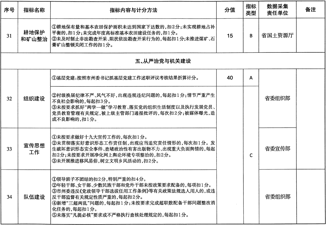 1.指標評估。根據“五位一體”總體布局和“四個(gè)全面”戰略布局,市州分經(jīng)濟發(fā)展、改革創(chuàng )新、民生保障、生態(tài)保護、從嚴治黨與機關(guān)建設五大類(lèi)指標進(jìn)行評估。省直單位分脫貧攻堅、重點(diǎn)工作、依法治省、機關(guān)管理四大類(lèi)指標進(jìn)行評估。