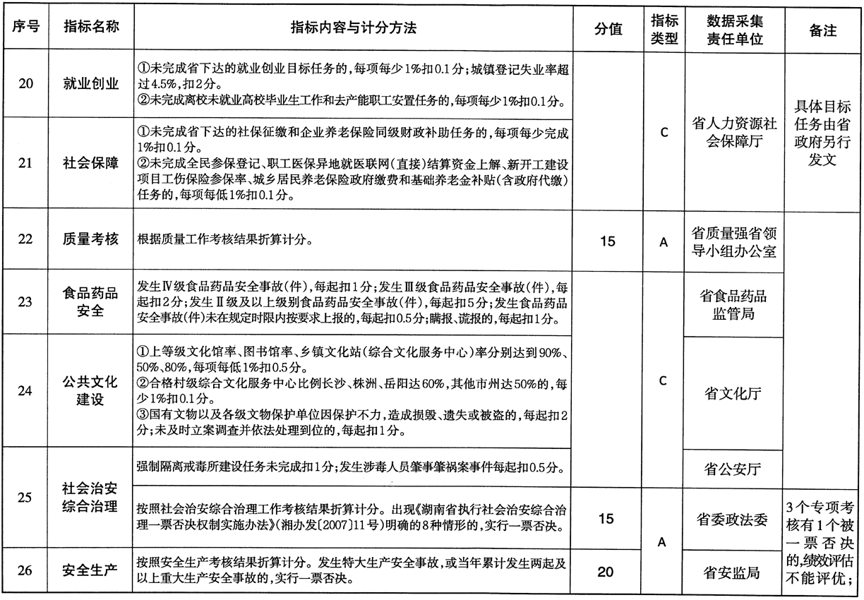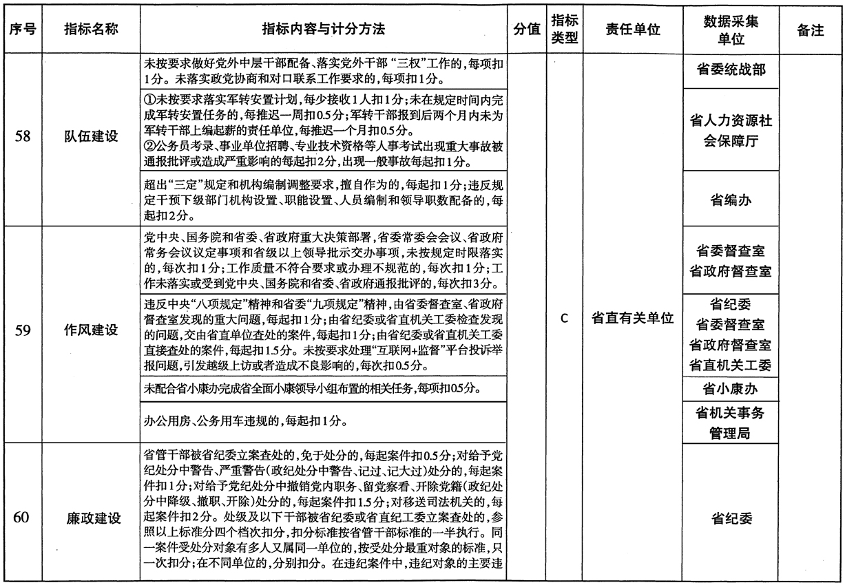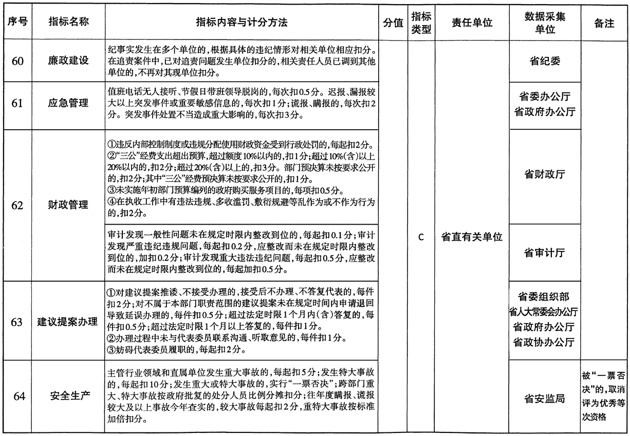 (四)不合格等次:有下列情形之一的單位,經(jīng)省績(jì)效評估委員會(huì )研究并報省委、省人民政府審定后,認定為不合格等次:安全生產(chǎn)、社會(huì )治安綜合治理、計劃生育有兩項及以上被一票否決的;因工作失職瀆職造成重大損失或惡劣影響的。