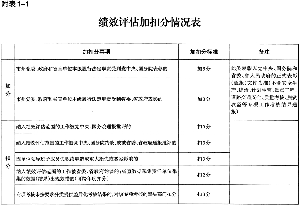 2.加分與扣分。加扣分的具體情形和標準(見(jiàn)《績(jì)效評估加扣分情況表》)(附表1—1)。市州和省直單位存在加分事項的,須在2018年1月10日前向省績(jì)效辦申報,由省績(jì)效辦審核決定;1月10日以后申報的計入下年度績(jì)效評估。
