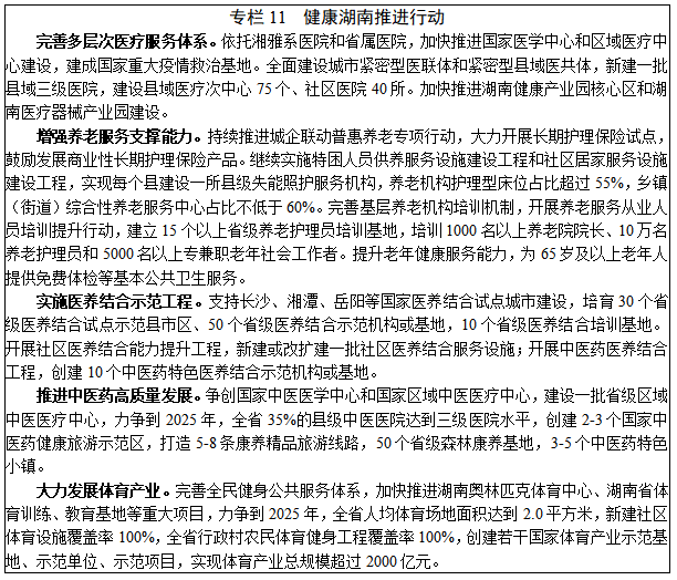 8.康養服務(wù)。深入實(shí)施“健康湖南行動(dòng)”,滿(mǎn)足城鄉居民多樣化、差異化、個(gè)性化的健康養老服務(wù)需求。力爭到2025年,基本建成服務(wù)全生命周期、結構合理、功能完善的健康服務(wù)體系,及覆蓋城鄉、分布均衡、惠及全民的養老服務(wù)體系。發(fā)展醫療健康服務(wù)。加快推進(jìn)國家醫學(xué)中心和國家區域醫療中心建設,統籌推進(jìn)省級區域醫療中心和優(yōu)質(zhì)醫療資源擴容下沉項目建設,完善農村三級衛生服務(wù)網(wǎng)絡(luò )和城市社區衛生機構,推進(jìn)標準化鄉鎮衛生院建設和村衛生室改造。引導社會(huì )辦醫差異化發(fā)展,鼓勵社會(huì )力量舉辦非營(yíng)利性醫療機構。完善家庭醫生簽約服務(wù)。發(fā)展“智慧醫院”,建設健康醫療大數據中心,大力推廣“遠程醫療”服務(wù),探索推進(jìn)可穿戴設備、智能健康電子產(chǎn)品和健康醫療移動(dòng)應用。完善提升養老服務(wù)。支持發(fā)展普惠型養老服務(wù),推動(dòng)養老機構規?;?、連鎖化、品牌化發(fā)展,支持國有企業(yè)參與發(fā)展養老服務(wù),引導社會(huì )資本投資,培育一批龍頭企業(yè)、新型養老產(chǎn)業(yè)集團,推動(dòng)培訓療養資源轉型發(fā)展養老服務(wù)。完善養老服務(wù)設施,推進(jìn)老舊小區適老化改造,補齊農村養老服務(wù)設施短板。發(fā)展社區居家養老服務(wù),促進(jìn)街道綜合養老服務(wù)中心和帶護理床位的城市社區日間照料中心全覆蓋。實(shí)施醫養結合示范工程和社區醫養結合能力提升工程,培育一批醫養結合示范機構和醫養結合試點(diǎn)示范區,積極推進(jìn)智慧健康養老應用試點(diǎn)示范。完善包括健康教育、預防保健、疾病診治、康復護理、長(cháng)期照護、安寧療護的綜合連續、覆蓋城鄉的老年健康服務(wù)體系。傳承創(chuàng )新中醫藥保健服務(wù)。健全覆蓋城鄉的中醫醫療保健服務(wù)體系,實(shí)施湖南省中醫治未病健康惠民工程和中醫康復服務(wù)工程。創(chuàng )建國家中醫藥綜合改革示范區,建立中藥材大數據服務(wù)平臺,新建一批中醫藥文化地標,研發(fā)推廣藥膳、藥飲、藥妝、藥浴等中醫藥保健產(chǎn)品,打造湖湘中醫藥服務(wù)品牌。發(fā)展體育健身服務(wù)。推進(jìn)職業(yè)體育發(fā)展,促進(jìn)體育項目協(xié)會(huì )改革和體育場(chǎng)館資源所有權、經(jīng)營(yíng)權分離改革,引導社會(huì )力量投資建設、運營(yíng)體育場(chǎng)所和設施。培育職業(yè)體育品牌賽事。發(fā)展運動(dòng)員經(jīng)紀、賽事組織、體育信息咨詢(xún)等中介服務(wù),擴大體育健身市場(chǎng)供給。加強公共體育服務(wù)體系建設,構建縣鄉村三級全民健身設施網(wǎng)絡(luò )和城市社區15分鐘健身圈。推進(jìn)“江、湖、山、道”全民健身品牌活動(dòng)和“一縣一品”特色體育項目,打造具有區域特色的健身示范基地和產(chǎn)業(yè)帶。培育多樣化康養服務(wù)。發(fā)展森林康養、中醫藥健康旅游、體育醫療康復等,建設一批高水平森林康養基地,健康醫療旅游示范區。