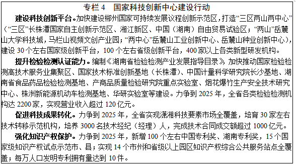 1.科技服務(wù)。圍繞產(chǎn)業(yè)鏈、部署創(chuàng )新鏈、完善服務(wù)鏈,促進(jìn)科技服務(wù)業(yè)專(zhuān)業(yè)化、集成化發(fā)展,構建覆蓋創(chuàng )新全鏈條、產(chǎn)品生產(chǎn)全周期的科技服務(wù)體系,打造國家科技創(chuàng )新中心。力爭到2025年,研發(fā)經(jīng)費投入年均增速高于12%。提升研究開(kāi)發(fā)能力。圍繞我省核心產(chǎn)業(yè)創(chuàng )新與發(fā)展需求,鼓勵企業(yè)開(kāi)展協(xié)同研發(fā)創(chuàng )新,重點(diǎn)建設一批國家級重點(diǎn)實(shí)驗室、技術(shù)創(chuàng )新中心、新型研發(fā)機構等,推動(dòng)大科學(xué)裝置及重大科技基礎設施建設,打造湖南省科研設施和科研儀器開(kāi)放共享服務(wù)平臺。大力發(fā)展設計服務(wù)。重點(diǎn)發(fā)展工業(yè)設計、工程設計、平面設計、文化創(chuàng )意設計等,培育一批具有國際競爭力的設計企業(yè),打造一批以產(chǎn)業(yè)集群為依托的設計產(chǎn)業(yè)集聚區。圍繞裝備制造、信息服務(wù)、消費品工業(yè)等領(lǐng)域,創(chuàng )建一批國家、省級工業(yè)設計中心和工業(yè)設計研究院,促進(jìn)“湖南制造”向“湖南創(chuàng )造”轉變。提高檢驗檢測認證服務(wù)水平。加快推進(jìn)湖南省檢驗檢測特色產(chǎn)業(yè)園建設,大力發(fā)展基礎檢測服務(wù),培育第三方質(zhì)量安全技術(shù)服務(wù),積極開(kāi)展線(xiàn)上檢驗檢測認證,發(fā)展面向設計開(kāi)發(fā)、生產(chǎn)制造、售后服務(wù)全過(guò)程的分析、測試、檢驗、認證等一體化服務(wù)。完善創(chuàng )新創(chuàng )業(yè)孵化孵育功能。鼓勵發(fā)展創(chuàng )新工場(chǎng)、虛擬創(chuàng )新社區等新型孵化平臺,加快科技孵化器、眾創(chuàng )空間、星創(chuàng )天地等“雙創(chuàng )”平臺建設,不斷提升孵化載體專(zhuān)業(yè)化服務(wù)水平。提高技術(shù)轉移轉化率。發(fā)展技術(shù)交易、技術(shù)評估、技術(shù)投融資等服務(wù),建設專(zhuān)業(yè)性、綜合性、市場(chǎng)化的科技成果轉移轉化機構。推動(dòng)高校、科研院所、產(chǎn)業(yè)聯(lián)盟、工程中心等面向市場(chǎng)開(kāi)展中試小試、技術(shù)熟化等集成服務(wù)。健全知識產(chǎn)權服務(wù)體系。加快知識產(chǎn)權交易運營(yíng)機構建設,促進(jìn)大數據、區塊鏈等在知識產(chǎn)權保護中的運用,探索發(fā)展知識產(chǎn)權創(chuàng )造與運營(yíng)的眾籌、眾包模式。鼓勵發(fā)展科技咨詢(xún)服務(wù)。開(kāi)展科技評估、科技管理服務(wù)外包、項目管理外包、知識產(chǎn)權代理等服務(wù),促進(jìn)科技信息資源市場(chǎng)化開(kāi)發(fā)利用。