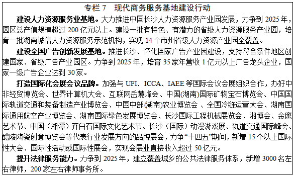 4.商務(wù)服務(wù)。加快推進(jìn)商務(wù)服務(wù)業(yè)品牌化、專(zhuān)業(yè)化、國際化發(fā)展,建設功能完備、業(yè)態(tài)豐富的現代商務(wù)服務(wù)基地。力爭到2025年,全省商務(wù)服務(wù)業(yè)增加值突破2000億元。提升人力資源服務(wù)供給水平。發(fā)展高級人才尋訪(fǎng)、人力資源管理咨詢(xún)、人力資源軟件開(kāi)發(fā)、靈活用工等服務(wù),大力推進(jìn)國家人力資源服務(wù)產(chǎn)業(yè)園建設,爭創(chuàng )一批“全國人力資源服務(wù)機構誠信示范單位”。培育會(huì )展服務(wù)品牌。大力發(fā)展數字會(huì )展,引進(jìn)國際知名會(huì )展品牌,提高現有場(chǎng)館配套設施的智能化和信息化水平,利用湖南企業(yè)國際化管理服務(wù)平臺,優(yōu)化湖南展會(huì )數據庫,規范展會(huì )信息發(fā)布。完善公共法律服務(wù)體系。提高法律服務(wù)質(zhì)量,發(fā)展涉外法律服務(wù)機構,加強法律服務(wù)隊伍建設,培養一批行業(yè)領(lǐng)軍人才和涉外法律人才,完善職業(yè)行為規范和誠信評價(jià)體系。大力推動(dòng)基本公共法律服務(wù)均衡發(fā)展,建設融合公共法律服務(wù)實(shí)體、網(wǎng)絡(luò )、熱線(xiàn)的平臺。促進(jìn)廣告產(chǎn)業(yè)轉型升級。推動(dòng)廣告業(yè)數字化轉型,運用AR、VR等技術(shù),拓展直播、短視頻等數字媒體推廣渠道,培育一批國家一級廣告企業(yè),建設一批國家、省級廣告產(chǎn)業(yè)園。完善廣告綜合監督體系,加大查處虛假違法廣告。大力發(fā)展專(zhuān)業(yè)咨詢(xún)服務(wù)。推動(dòng)會(huì )計、審計、資產(chǎn)評估、信用評估等行業(yè)發(fā)展,豐富品牌策劃、營(yíng)銷(xiāo)策劃、財務(wù)顧問(wèn)、后勤管理等企業(yè)管理服務(wù)。