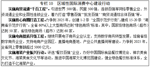 7.現代商貿。圍繞打造國內大循環(huán)和國內國際雙循環(huán)重要節點(diǎn),積極營(yíng)造放心消費環(huán)境,促進(jìn)消費新業(yè)態(tài)、新模式、新場(chǎng)景的普及應用,打造區域性國際消費中心。力爭“十四五”期間,全省社會(huì )消費品零售總額年均增長(cháng)7%左右。推動(dòng)零售業(yè)轉型升級。加快便利店品牌化、連鎖化、智能化發(fā)展,開(kāi)展“湖南省示范步行街”創(chuàng )建,建設一批現代商業(yè)綜合體、一站式大型購物中心、大型品牌折扣店等。促進(jìn)新零售發(fā)展,拓展無(wú)接觸、少接觸消費模式,大力發(fā)展智慧超市、智慧商店等。支持長(cháng)沙創(chuàng )建區域性國際消費中心城市。完善批發(fā)市場(chǎng)體系。圍繞有色金屬、工程機械、特色農產(chǎn)品等優(yōu)勢產(chǎn)業(yè),打造輻射中西部、影響全國的區域批發(fā)市場(chǎng)。鼓勵商貿市場(chǎng)跨行業(yè)、跨領(lǐng)域融合發(fā)展,增強信息、交易、加工、配送、融資、擔保等一體化綜合服務(wù)能力。促進(jìn)住宿業(yè)提檔升級。培養閑暇經(jīng)濟和度假文化,引進(jìn)國內外高端酒店品牌和管理公司,提升住宿業(yè)標準水平。發(fā)展具有湖湘文化、民族地域特色的民宿酒店,促進(jìn)經(jīng)濟型酒店品牌化、連鎖化、集團化發(fā)展。做大做強餐飲業(yè)。推進(jìn)餐飲業(yè)連鎖化經(jīng)營(yíng),發(fā)展中央廚房,拓展在線(xiàn)訂餐、美食鑒賞、顧客點(diǎn)評等服務(wù)功能。實(shí)施湘菜產(chǎn)業(yè)振興行動(dòng),開(kāi)發(fā)新派湘菜,傳承湘菜名品,打造具有湖南特色的地方名店、名菜、名小吃等美食名片,推動(dòng)湘菜出湘。促進(jìn)電商創(chuàng )新發(fā)展。加快發(fā)展跨境電商、農村電商、社區電商、工業(yè)電商、生鮮電商、直播電商等新模式。完善農村電商服務(wù)體系,開(kāi)展“數商興農”行動(dòng),壯大網(wǎng)銷(xiāo)“一縣一品”品牌,持續推動(dòng)農產(chǎn)品上行,提升農村電商與快遞物流協(xié)同發(fā)展水平。全面推進(jìn)長(cháng)沙、湘潭、岳陽(yáng)、郴州等跨境電子商務(wù)綜合試驗區建設。推動(dòng)電子商務(wù)領(lǐng)域信用記錄共建共享,完善市場(chǎng)化信用評價(jià)體系。擴大特色消費市場(chǎng)。促進(jìn) “銀發(fā)經(jīng)濟”“她經(jīng)濟”“童經(jīng)濟”“夜經(jīng)濟”發(fā)展,打造老人、女性、兒童友好的消費空間,充分挖掘夜間觀(guān)光、娛樂(lè )、餐飲資源,重點(diǎn)打造“長(cháng)沙夜星城”全國品牌,培育特色精品的夜間消費功能區和示范區。