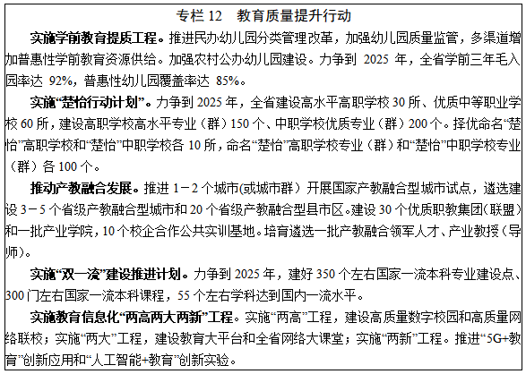 9.教育培訓。統籌公辦教育和民辦教育發(fā)展,建立覆蓋全員、全過(guò)程、全方位的育人體系。普及學(xué)前教育。實(shí)施學(xué)前教育提質(zhì)工程,大力發(fā)展普惠性學(xué)前教育,構建覆蓋城鄉、布局合理、公益普惠的學(xué)前教育公共服務(wù)體系。健全職業(yè)教育。推進(jìn)部省共建職業(yè)教育改革發(fā)展高地工程,大力實(shí)施“楚怡行動(dòng)計劃”,促進(jìn)產(chǎn)教融合發(fā)展。推動(dòng)中職教育特色發(fā)展,提升高等職業(yè)教育發(fā)展水平,積極穩妥開(kāi)展本科層次職業(yè)教育試點(diǎn)。完善終身教育。推動(dòng)終身教育創(chuàng )新規范發(fā)展,建立全民終身學(xué)習推進(jìn)機制,發(fā)揮在線(xiàn)教育優(yōu)勢,完善終身學(xué)習體系,建設學(xué)習型社會(huì )。推進(jìn)湖南開(kāi)放大學(xué)建設。擴大老年教育資源供給,搭建老年教育資源共享和公共服務(wù)平臺。提質(zhì)高等教育。實(shí)施“雙一流”建設推進(jìn)計劃,著(zhù)力培養世界一流和國內一流學(xué)校與學(xué)科。高質(zhì)量發(fā)展研究生教育,大力優(yōu)化培養類(lèi)型結構。支持高校引進(jìn)國(境)外優(yōu)質(zhì)資源,開(kāi)展高水平高質(zhì)量合作辦學(xué),做強“留學(xué)湖南”品牌。發(fā)展智慧教育。以“國家教育信息化 2.0 試點(diǎn)省”為抓手,加快推進(jìn)新型基礎網(wǎng)絡(luò )、數字校園、學(xué)習終端等建設,打造一批教育信息化融合應用實(shí)驗區和教育信息化創(chuàng )新試點(diǎn)學(xué)校,探索5G和人工智能等條件下的教育新形態(tài)。