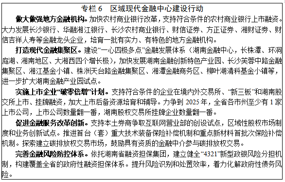 3.現代金融。增強金融服務(wù)實(shí)體經(jīng)濟能力,推進(jìn)金融產(chǎn)品和服務(wù)創(chuàng )新,建設多層次資本市場(chǎng)體系,深化金融改革和擴大開(kāi)放,提升金融風(fēng)險防控能力,建立與“三高四新”戰略相適應的現代金融服務(wù)體系,打造區域現代金融中心。力爭到2025年,全省金融業(yè)增加值占GDP比重達到6%左右。強化服務(wù)實(shí)體經(jīng)濟能力。重點(diǎn)發(fā)展數字普惠金融,提高小微企業(yè)信用貸款占比和制造業(yè)中長(cháng)期貸款比重。強化科技金融發(fā)展,加大科技信貸投入,鼓勵開(kāi)展知識產(chǎn)權質(zhì)押融資、科技融資擔保等業(yè)務(wù)。發(fā)展綠色金融,創(chuàng )建國家綠色金融改革創(chuàng )新試驗區,引導金融機構加大對低碳產(chǎn)業(yè)、清潔能源、節能環(huán)保等領(lǐng)域信貸投放力度。推進(jìn)“一縣兩行”建設,促進(jìn)金融業(yè)支持鄉村振興。探索創(chuàng )新供應鏈金融服務(wù)模式。完善保險市場(chǎng),創(chuàng )新發(fā)展科技保險,推廣發(fā)展專(zhuān)利保險、安全生產(chǎn)責任險等,健全農業(yè)保險體系,穩步拓展基礎保險服務(wù)“村村通”試點(diǎn)范圍。建設多層次資本市場(chǎng)體系。實(shí)施上市企業(yè)“破零倍增”計劃。爭取湖南股權交易所納入全國區域股權市場(chǎng)試點(diǎn)范圍,發(fā)揮好現有有色金屬、林權、能源交易等平臺作用,設立軍民融合、文化創(chuàng )意等特色板塊。大力發(fā)展私募股權基金,加快湘江基金小鎮等基金集聚區建設。發(fā)展新型金融服務(wù)。支持消費金融、產(chǎn)業(yè)基金等新興金融服務(wù)發(fā)展,申請設立期貨交割庫,引導“7+4”類(lèi)地方金融組織、互聯(lián)網(wǎng)金融平臺和第三方支付行業(yè)規范發(fā)展。穩步推進(jìn)金融改革開(kāi)放。促進(jìn)金融業(yè)數字化轉型,積極穩妥推進(jìn)長(cháng)沙數字人民幣試點(diǎn)工作,適時(shí)將數字人民幣試點(diǎn)工作向全省推廣。創(chuàng )新中國(湖南)自由貿易試驗區金融服務(wù),引進(jìn)國際優(yōu)質(zhì)金融資源,拓展地方金融機構境外融資業(yè)務(wù)和企業(yè)境外融資渠道。防范化解地方金融風(fēng)險。加強地方金融信用體系建設,建立健全全省地方金融風(fēng)險監測預警平臺和中小企業(yè)信用信息服務(wù)平臺,推動(dòng)地方金融信用信息共享應用和金融風(fēng)險防控全覆蓋。