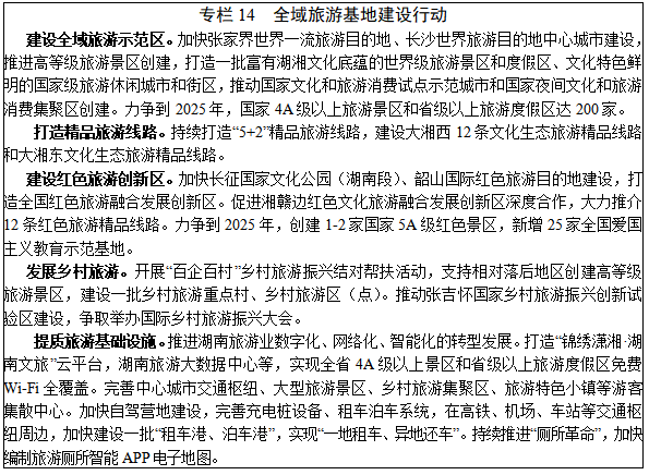 11.旅游業(yè)。深入挖掘自然生態(tài)、人文歷史、民族風(fēng)情等旅游資源,促進(jìn)文化和旅游融合,豐富文旅服務(wù)供給,全面提升旅游服務(wù)質(zhì)量和“錦繡瀟湘”旅游品牌知名度,著(zhù)力打造“五大板塊、五大協(xié)作區、三個(gè)走廊”的“553”文旅發(fā)展格局,建設世界知名旅游目的地、全域旅游基地。力爭到2025年,全省旅游總收入突破1.5萬(wàn)億元。開(kāi)發(fā)生態(tài)旅游資源。充分利用武陵山、雪峰山、南嶺、羅霄山、南山、洞庭湖等自然生態(tài)資源,大力開(kāi)發(fā)山地避暑、湖泊度假、山地運動(dòng)、生態(tài)康養、森林體驗、生態(tài)露營(yíng)等產(chǎn)品,著(zhù)力打造一批國家級生態(tài)旅游目的地、生態(tài)旅游景區。培育紅色旅游市場(chǎng)。著(zhù)力打造湘東、湘南、湘西三大紅色旅游發(fā)展帶,深入推進(jìn)湘贛邊紅色文化旅游融合發(fā)展,加快長(cháng)征沿線(xiàn)地區紅色旅游項目和韶山—井岡山紅色旅游鐵路建設,保護利用偉人故里、革命人物故居,大力開(kāi)發(fā)紅色旅游精品線(xiàn)路,推出一批廉政文化教育基地、黨員紅色文化教育基地、紅色研學(xué)旅行基地、紅色旅游小鎮和紅色旅游鄉村振興重點(diǎn)村,提升湖南紅色旅游文化節影響力。提高鄉村旅游質(zhì)量。完善鄉村旅游配套設施,探索發(fā)展都市依托型、景區依托型、民俗風(fēng)情型、古村古鎮型、紅色文化型、現代農業(yè)型、創(chuàng )意農業(yè)型等創(chuàng )新模式。發(fā)展人文特色旅游。以大湘西和大湘南地區“全國少數民族特色村寨”為重點(diǎn),設計開(kāi)發(fā)具有湖南特色的民族風(fēng)俗旅游產(chǎn)品。以炎帝陵、舜帝陵為重點(diǎn),打造始祖文化目的地。依托歷史文化名城、名鎮,傳統古村落、古街區等人文古跡,在保留遺產(chǎn)原真性的基礎上進(jìn)行合理的旅游開(kāi)發(fā)。鼓勵非遺進(jìn)景區,促進(jìn)非遺的傳承保護與開(kāi)發(fā)利用。拓展文旅新業(yè)態(tài)。大力發(fā)展都市旅游、民宿風(fēng)情、徒步探險、低空飛行、研學(xué)旅游、工業(yè)旅游等新業(yè)態(tài)。鼓勵VR、AI、全息技術(shù)等在旅游體驗中應用,大力發(fā)展沉浸式旅游、體驗式旅游。