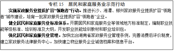 12.居民和家庭服務(wù)。進(jìn)一步完善家政、托育、物業(yè)、社區等服務(wù)標準,提升從業(yè)人員素質(zhì),健全行業(yè)誠信體系,滿(mǎn)足城鎮居民家庭多元化、個(gè)性化、高品質(zhì)的服務(wù)需求。提升家政服務(wù)。發(fā)展母嬰服務(wù)、養老護理、家庭管理、鐘點(diǎn)廚師等全方位、精細化服務(wù)。開(kāi)展家政服務(wù)提質(zhì)擴容“領(lǐng)跑者”行動(dòng),培育連鎖家政服務(wù)品牌。大力發(fā)展“互聯(lián)網(wǎng)+家政”, 推動(dòng)居民和家庭服務(wù)等消費領(lǐng)域信用體系建設。完善托育服務(wù)。強化集中托育、育兒指導、養護培訓等服務(wù),建立家庭托育點(diǎn)登記備案制度,研究出臺家庭托育點(diǎn)管理辦法,支持普惠性嬰幼兒照護服務(wù)機構發(fā)展,建立集中管理運營(yíng)的社區托育服務(wù)網(wǎng)絡(luò )。鼓勵發(fā)展互聯(lián)網(wǎng)直播互動(dòng)式家庭育兒服務(wù),開(kāi)發(fā)嬰幼兒養育課程、父母課堂等,培育智慧托育新業(yè)態(tài)。規范物業(yè)服務(wù)。鼓勵物業(yè)企業(yè)向智慧社區運營(yíng)商轉型,延伸安全、購物、教育、養老等服務(wù)功能。推進(jìn)智慧物業(yè)管理服務(wù)平臺建設,構建物業(yè)管理、政務(wù)服務(wù)、公共服務(wù)和生活服務(wù)一體化平臺,促進(jìn)物業(yè)服務(wù)線(xiàn)上線(xiàn)下融合發(fā)展。完善物業(yè)服務(wù)市場(chǎng)監管體系,建立健全物業(yè)管理信息公開(kāi)公示制度和企業(yè)信用管理制度,優(yōu)化物業(yè)服務(wù)市場(chǎng)競爭環(huán)境。發(fā)展社區服務(wù)。加快推進(jìn)社區綜合服務(wù)中心建設,建立提供餐飲零售、家政服務(wù)、美容美發(fā)、洗滌保養、售后維修、養老服務(wù)等生活性服務(wù)的“一站式”社區服務(wù)體系。提高社區服務(wù)智能化水平,完善自助服務(wù)設施布局。
