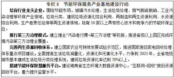 5.節能環(huán)保服務(wù)。推進(jìn)生態(tài)強省建設,促進(jìn)生產(chǎn)生活方式綠色轉型,建設全國重要的節能環(huán)保服務(wù)產(chǎn)業(yè)基地。力爭 “十四五”期間,全省節能環(huán)保服務(wù)業(yè)產(chǎn)值年均增長(cháng)15%以上。發(fā)展節能服務(wù)。推動(dòng)發(fā)展合同能源管理,積極推廣節能咨詢(xún)、診斷、設計、融資、改造、托管等“一站式”綜合服務(wù)模式,實(shí)施“能效領(lǐng)跑者”制度,持續推進(jìn)低碳、節能產(chǎn)品認證,推廣低碳、節能技術(shù)應用,開(kāi)展國家級節約型公共機構示范單位創(chuàng )建。壯大環(huán)保服務(wù)。發(fā)展生態(tài)修復、環(huán)境風(fēng)險與損害評價(jià)、排污權交易、綠色認證等環(huán)保服務(wù),探索環(huán)境管家、綠色聯(lián)盟、產(chǎn)業(yè)共生、第三方環(huán)境服務(wù)等新模式,鼓勵發(fā)展環(huán)保服務(wù)總承包和環(huán)境治理特許經(jīng)營(yíng),推進(jìn)小城鎮環(huán)境綜合治理托管服務(wù)國家試點(diǎn)。培育“碳達峰”“碳中和”衍生服務(wù)。拓展碳資產(chǎn)管理、碳咨詢(xún)、碳排放權交易,完善碳市場(chǎng)管理層級和能源消費雙控制度,積極參與國家碳排放交易市場(chǎng)建設和氣候投融資試點(diǎn),開(kāi)展空氣質(zhì)量達標與碳排放達峰“雙達”試點(diǎn)示范創(chuàng )建。完善再生資源回收體系。推進(jìn)廢舊家電回收處理體系建設,建立健全廢舊農用物資回收利用網(wǎng)絡(luò ),建設線(xiàn)上線(xiàn)下融合的廢舊資源回收和循環(huán)利用平臺。鼓勵具備條件的縣市區實(shí)施生活垃圾強制分類(lèi)。