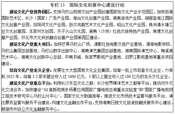 10.文化產(chǎn)業(yè)。遵循“守正創(chuàng )新”發(fā)展理念,挖掘湖湘特色文化,大力發(fā)展數字文化產(chǎn)業(yè),擴大文化產(chǎn)品和服務(wù)供給,打造具有國際影響力的文化創(chuàng )意中心。力爭到2025年,全省規模以上文化企業(yè)數量達到5000家,營(yíng)業(yè)收入達到5000億元。鞏固影視傳媒業(yè)優(yōu)勢地位。全面提升電視劇、綜藝節目、紀錄片等傳統節目質(zhì)量,開(kāi)發(fā)豎屏節目、互動(dòng)節目、沉浸式節目等新興視頻節目,做強以湖南衛視為主的電視媒體,推動(dòng)“數字湖南·智慧廣電”建設,加快發(fā)展高新視頻內容產(chǎn)業(yè),著(zhù)力打造馬欄山國家5G高新視頻內容產(chǎn)業(yè)核心基地。提升電影制作、發(fā)行、播映和開(kāi)發(fā)能力。加快新聞出版業(yè)轉型發(fā)展。做大做強湘版圖書(shū)品牌,推進(jìn)IP全版權運營(yíng),提升編、印、發(fā)、供全流程融合化、數字化、智能化水平,推進(jìn)實(shí)體書(shū)店信息化升級和改造。促進(jìn)演藝娛樂(lè )業(yè)提質(zhì)升級。支持具有湘情湘味的戲曲、民樂(lè )、雜技等演藝作品演出,提質(zhì)升級旅游景點(diǎn)演藝節目,扶持大型演藝機構建設文化藝術(shù)經(jīng)營(yíng)綜合體,深度布局藝術(shù)生產(chǎn)、制作、宣傳、票務(wù)銷(xiāo)售、演出場(chǎng)所等全產(chǎn)業(yè)鏈。鼓勵動(dòng)漫游戲業(yè)創(chuàng )新發(fā)展。支持湖湘原創(chuàng )漫畫(huà)、影視動(dòng)畫(huà)、網(wǎng)絡(luò )動(dòng)漫、手機動(dòng)漫等開(kāi)發(fā),加快動(dòng)漫游戲、虛擬仿真及衍生產(chǎn)品服務(wù)的拓展應用,加強動(dòng)漫游戲關(guān)鍵技術(shù)研發(fā),打造一批動(dòng)漫游戲原創(chuàng )作品。開(kāi)發(fā)湖湘特色文化資源。深入挖掘紅色文化、湘商文化、書(shū)院文化價(jià)值,拓展《湖湘文庫》的利用價(jià)值。保護傳承少數民族特色文化,加強對民間文學(xué)、民俗文化、民間音樂(lè )舞蹈戲曲的保護,扶持民族民間文化社團組織發(fā)展,打造一批民間文化藝術(shù)之鄉。鼓勵合理利用文物和非物質(zhì)文化遺產(chǎn)資源進(jìn)行文藝創(chuàng )作和文創(chuàng )設計,開(kāi)發(fā)相關(guān)文創(chuàng )產(chǎn)品,重點(diǎn)推進(jìn)湘繡、湘瓷、湘茶、煙花等提質(zhì)升級。發(fā)展數字文化產(chǎn)業(yè)。推動(dòng)文化旅游、演藝娛樂(lè )、文博會(huì )展、廣播電視等行業(yè)數字化轉型,培育數字電影、網(wǎng)絡(luò )游戲、數字音樂(lè )、數字出版、網(wǎng)絡(luò )視聽(tīng)等新興產(chǎn)業(yè),促進(jìn)網(wǎng)絡(luò )文學(xué)、網(wǎng)絡(luò )音樂(lè )、網(wǎng)絡(luò )演出、網(wǎng)絡(luò )自制劇、微電影、短視頻、直播作品等新興文化作品繁榮有序發(fā)展。依托優(yōu)勢文化產(chǎn)業(yè)園區,建設一批數字文化產(chǎn)業(yè)集群。