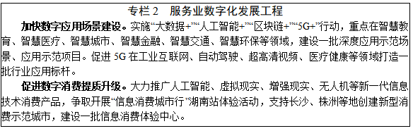 拓展服務(wù)業(yè)數字化應用。培育壯大人工智能、大數據、區塊鏈、云計算、網(wǎng)絡(luò )安全等新興數字產(chǎn)業(yè),重點(diǎn)在智慧城市、智慧工廠(chǎng)、智慧交通、智慧環(huán)保等領(lǐng)域塑造應用場(chǎng)景,推動(dòng)典型場(chǎng)景和垂直行業(yè)的融合應用。開(kāi)展新型智慧城市、智慧縣域試點(diǎn)示范,建設“城市大腦”通用平臺,提升城市交通、公共安全、民生服務(wù)、城市管理等智慧應用水平。發(fā)展人工智能+5G+工業(yè)互聯(lián)網(wǎng)+產(chǎn)業(yè)融合創(chuàng )新智慧工廠(chǎng)應用場(chǎng)景,實(shí)現生產(chǎn)設備網(wǎng)絡(luò )化、生產(chǎn)數據可視化、生產(chǎn)過(guò)程透明化、生產(chǎn)現場(chǎng)無(wú)人化。依托國家智能網(wǎng)聯(lián)汽車(chē)(長(cháng)沙)測試區、長(cháng)株潭智能城際磁懸浮交通系統試驗與示范基地,推進(jìn)智能網(wǎng)聯(lián)數據平臺、智能車(chē)輛和設備研發(fā)、智能公交體系建設,著(zhù)力發(fā)展智能網(wǎng)聯(lián)汽車(chē)、智能軌道交通等應用場(chǎng)景。圍繞洞庭湖區生態(tài)保護、礦山資源回收利用等,發(fā)展智慧旅游、智慧生態(tài)、智慧礦山應用場(chǎng)景,實(shí)現生態(tài)環(huán)境情況自動(dòng)檢測、智能監測、智能控制與智慧調度。促進(jìn)共享經(jīng)濟、平臺經(jīng)濟健康發(fā)展。