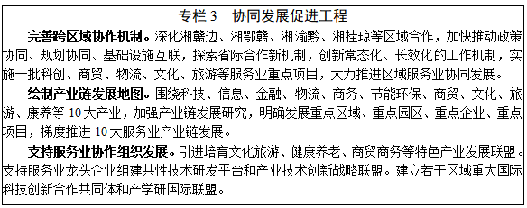 加強服務(wù)業(yè)跨區域協(xié)作。以中部崛起戰略為契機,加強對接長(cháng)江經(jīng)濟帶、粵港澳大灣區、西部陸海新通道等國家區域戰略,強化與周邊省、城市群、城市間不同層級跨區域協(xié)同合作。加快推進(jìn)湘贛邊區域開(kāi)放合作示范區建設,深化湘鄂贛協(xié)同發(fā)展,大力推進(jìn)中部地區省際間基礎設施互通、產(chǎn)業(yè)協(xié)同發(fā)展、生態(tài)環(huán)境共保聯(lián)治等,促進(jìn)中部地區加快崛起。大力推進(jìn)長(cháng)株潭都市圈建設,密切與武漢都市圈、昌九都市圈、成渝地區雙城經(jīng)濟圈的深入鏈接,促進(jìn)商貿物流、文化旅游、科技信息等方面合作,建設長(cháng)江上中下游服務(wù)業(yè)密切合作經(jīng)濟帶。加強與粵港澳大灣區的深度合作,深入推進(jìn)泛珠三角區域合作機制,積極對接廣深港澳科技走廊,促進(jìn)旅游休閑康養聯(lián)動(dòng),建設京廣線(xiàn)戰略新興產(chǎn)業(yè)承接帶。加強湘西地區與西部省份的交流協(xié)作,推進(jìn)湘渝黔文化旅游、醫療康養、商貿流通等領(lǐng)域合作,建設湘渝黔邊城協(xié)作發(fā)展合作區。深化與北部灣地區在東盟國家物流產(chǎn)業(yè)園、多式聯(lián)運、國際中轉運輸等合作,促進(jìn)湘桂瓊商貿合作。