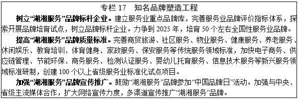 培育“湖湘服務(wù)”品牌。推動(dòng)行業(yè)協(xié)會(huì )、第三方機構開(kāi)展服務(wù)品牌培育和塑造,研究建立服務(wù)品牌培育和評價(jià)體系。加強對服務(wù)業(yè)企業(yè)的品牌孵化,培育形成一批擁有自主知識產(chǎn)權和核心競爭力的品牌企業(yè),爭創(chuàng )“中國質(zhì)量獎”“中華老字號”“省長(cháng)質(zhì)量獎”。開(kāi)展品牌價(jià)值評價(jià),確立品牌無(wú)形資產(chǎn)的地位,提升品牌價(jià)值和效應。強化服務(wù)品牌保護,嚴厲打擊查處侵權假冒服務(wù)品牌行為。加強湖南服務(wù)品牌宣傳、推廣力度,擴大 “湖南老字號”品牌隊伍,提升“錦繡瀟湘”、文化湘軍品牌影響力,打造具有國際知名度的“湖湘服務(wù)”品牌。