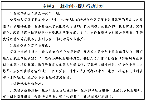 3.完善重點(diǎn)群體就業(yè)支持體系。突出做好高校畢業(yè)生、農民工、脫貧人口、退捕漁民、退役軍人、就業(yè)困難人員等重點(diǎn)群體就業(yè)工作。堅持把高校畢業(yè)生就業(yè)作為重中之重,結合重大戰略布局、現代產(chǎn)業(yè)體系建設、中小企業(yè)創(chuàng )新發(fā)展,創(chuàng )造更多有利于發(fā)揮高校畢業(yè)生專(zhuān)長(cháng)和智力優(yōu)勢的知識技術(shù)型就業(yè)崗位。圍繞鄉村振興戰略,服務(wù)鄉村建設行動(dòng)和基層治理,擴大基層教育、醫療衛生、社區服務(wù)、農業(yè)技術(shù)等領(lǐng)域就業(yè)空間。統籌實(shí)施“三支一扶”計劃等基層服務(wù)項目,暢通基層成長(cháng)發(fā)展通道,引導更多畢業(yè)生到艱苦邊遠地區、新興產(chǎn)業(yè)、中小微企業(yè)就業(yè)。為有意愿、有能力的高校畢業(yè)生創(chuàng )新創(chuàng )業(yè)提供資金、場(chǎng)地和技術(shù)等多層次支持。強化不斷線(xiàn)就業(yè)服務(wù),多渠道搭建職業(yè)指導、職業(yè)培訓、就業(yè)見(jiàn)習、創(chuàng )業(yè)實(shí)踐平臺,對困難畢業(yè)生和長(cháng)期失業(yè)青年實(shí)施就業(yè)幫扶。組織“春風(fēng)行動(dòng)”“就業(yè)援助月”“高校畢業(yè)生就業(yè)服務(wù)周”“民營(yíng)企業(yè)招聘月”等公共就業(yè)服務(wù)專(zhuān)項活動(dòng),對高校組織的校園招聘活動(dòng)給予校園招聘活動(dòng)補助。落實(shí)鄉村振興戰略,深化勞務(wù)協(xié)作組織化程度,促進(jìn)勞動(dòng)力供需有效對接,推動(dòng)農民工有序外出就業(yè)。加大農民工創(chuàng )業(yè)扶持力度,暢通外出務(wù)工人員返鄉創(chuàng )業(yè)就業(yè)渠道,擴大返鄉留鄉農民工就地就近就業(yè)規模。建立促進(jìn)農村脫貧人口就業(yè)增收的長(cháng)效機制,優(yōu)先幫扶脫貧人口穩崗就業(yè)。加大退捕漁民轉產(chǎn)就業(yè)幫扶力度,確保有就業(yè)意愿未就業(yè)退捕漁民保持動(dòng)態(tài)清零。落實(shí)退役軍人就業(yè)優(yōu)待政策,將退役軍人按規定納入現有就業(yè)服務(wù)、職業(yè)培訓等政策覆蓋范圍。加強就業(yè)援助,把解決失業(yè)人員再就業(yè)問(wèn)題擺在突出位置,暢通失業(yè)人員求助渠道,健全失業(yè)登記、職業(yè)介紹、職業(yè)培訓、職業(yè)指導、生活保障聯(lián)動(dòng)機制,促進(jìn)失業(yè)人員盡快實(shí)現就業(yè),保障基本生活。動(dòng)態(tài)調整就業(yè)困難人員認定標準,健全就業(yè)困難人員就業(yè)援助機制,對城鄉就業(yè)困難人員建立臺賬、動(dòng)態(tài)管理,提供優(yōu)先扶持和重點(diǎn)幫助。對通過(guò)市場(chǎng)渠道難以實(shí)現就業(yè)的就業(yè)困難人員,合理開(kāi)發(fā)公益性崗位托底安置,確保零就業(yè)家庭動(dòng)態(tài)清零。開(kāi)展高質(zhì)量就業(yè)幫扶服務(wù)活動(dòng),對各類(lèi)重點(diǎn)群體分類(lèi)幫扶、精準援助和跟蹤服務(wù)。積極開(kāi)發(fā)老齡人力資源,發(fā)展銀發(fā)經(jīng)濟。