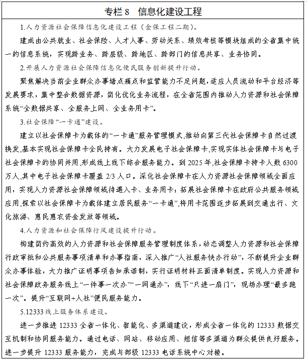 7.人力資源和社會(huì )保障公共服務(wù)體系更加完善。人力資源和社會(huì )保障公共服務(wù)制度和標準體系全面建立,智慧服務(wù)能力顯著(zhù)提高,社會(huì )保障卡發(fā)行應用全覆蓋,基層公共服務(wù)條件進(jìn)一步完善,基本公共服務(wù)可及性、均等化顯著(zhù)增強,實(shí)現公共服務(wù)一體化,服務(wù)渠道多元化,信息服務(wù)智能化。