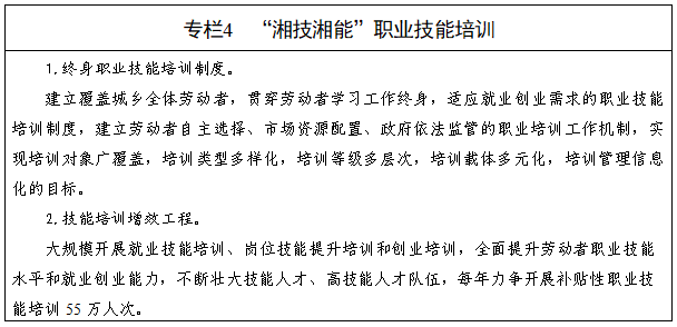 7.大規模開(kāi)展職業(yè)技能培訓。建立并推行覆蓋城鄉全體勞動(dòng)者、貫穿勞動(dòng)者生涯全過(guò)程、適應就業(yè)創(chuàng )業(yè)和人才成長(cháng)需要以及經(jīng)濟社會(huì )發(fā)展需求的終身職業(yè)技能培訓制度。加快推進(jìn)公共實(shí)訓基地共建共享,強化職業(yè)技能培訓供需對接。實(shí)施技能培訓增效工程,著(zhù)力打造“湘技湘能”職業(yè)技能培訓品牌。圍繞“現代農民培育計劃”,深入開(kāi)展現代農民職業(yè)技能培訓;圍繞“農村實(shí)用人才帶頭人素質(zhì)提升計劃”,加快高素質(zhì)農村實(shí)用技能人才培養;圍繞人才一體化培養,推進(jìn)農民培訓與職業(yè)教育銜接。大規模開(kāi)展高質(zhì)量職業(yè)技能培訓,不斷完善企業(yè)新型學(xué)徒制培訓制度,實(shí)現培訓對象廣覆蓋、培訓類(lèi)型多樣化、培訓等級多層次、培訓載體多元化、培訓管理信息化,加大培訓資金投入,提高培訓質(zhì)量,提升勞動(dòng)者就業(yè)創(chuàng )業(yè)能力。
