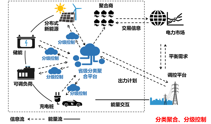 (十五)推動(dòng)源網(wǎng)荷儲電力資源分類(lèi)分級聚合。基于統一的數字底座、物聯(lián)采集與實(shí)時(shí)量測中心等技術(shù)架構,建立和完善省級源網(wǎng)荷儲分類(lèi)聚合平臺,通過(guò)統一平臺對源網(wǎng)荷儲四側資源分散聚合控制,實(shí)現電力系統分層分級的綜合動(dòng)態(tài)平衡。開(kāi)展源網(wǎng)荷儲分類(lèi)分級聚合頂層設計,研究制定分類(lèi)分級聚合的技術(shù)路徑和實(shí)施方案。推動(dòng)分布式光伏運營(yíng)監測平臺、配電監控系統的升級改造和分級應用,實(shí)現對分布式光伏的“剛性控”“柔性控”“群調群控”等多場(chǎng)景靈活控制。完善常規中小電源聚合平臺,調動(dòng)中小電源深度聚合的積極性,提升中小電源統一調度能力,實(shí)現廣域協(xié)同、靈活互動(dòng)。深化建設新型負荷管理平臺,提升新型負荷管理系統智能化、實(shí)用化水平,對負荷資源分層分類(lèi)統一管理、統一調控、統一服務(wù)。建設用戶(hù)側儲能監控平臺,分級分類(lèi)接入用戶(hù)側儲能電站數據,實(shí)現海量用戶(hù)側儲能資源更大范圍的共享互濟和優(yōu)化配置。建立適應源網(wǎng)荷儲分類(lèi)分級聚合的調度模式和交易機制,貫穿省、市、縣三級調度系統,制定并網(wǎng)管理、運行控制相關(guān)標準規范,完善清潔能源、需求側資源和儲能參與電力市場(chǎng)的機制,依托統一的信息共享和技術(shù)支持平臺,培育多類(lèi)型聚合商參與分層分級聚合調度。構建基于電網(wǎng)一張圖的新型電力系統全要素數字底座,開(kāi)展新型電力系統各要素承載力的可視化推演計算,實(shí)現配網(wǎng)各環(huán)節、各業(yè)務(wù)以及新要素的全面圖上管控,提升分布式資源消納能力。