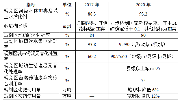堅持源頭減排與末端治理相結合,以對洞庭湖水質(zhì)具有重大影響的13個(gè)控制單元作為水污染防治重點(diǎn)治理區,圍繞優(yōu)先控制單元斷面水質(zhì)達標和改善,著(zhù)力完善城鎮環(huán)境基礎設施,防治工業(yè)點(diǎn)源污染,加強養殖業(yè)、種植業(yè)污染防治,切實(shí)削減入湖污染物排放量。到2020年,污染物入湖總量得到嚴格控制,入湖河流控制斷面水質(zhì)達到Ⅲ類(lèi)及以上,流域化學(xué)需氧量、氨氮入湖總量控制在108.57萬(wàn)噸/年、13.58萬(wàn)噸/年,洞庭湖區化學(xué)需氧量和氨氮入湖總量分別控制在31.59萬(wàn)噸/年和4.09萬(wàn)噸/年以?xún)?。洞庭湖所有國控斷面總磷均穩定低于0.1毫克/升,其它指標同步達到國家要求。規劃區設市城市污水處理率達到95%以上,縣城達到90%以上。地級市污泥無(wú)害化處理處置率達到90%以上,縣級市達到75%以上,縣城力爭達到60%以上??h級及以上城市生活垃圾無(wú)害化處理率達到95%以上。畜禽養殖廢棄物綜合利用率達到75%以上?;适褂昧拷档?%以上,農藥使用量降低12%以上,農村廁所糞污基本得到處理或資源化利用。預測到2025年,規劃區河流水體Ⅲ類(lèi)及以上水質(zhì)比例達95%(洞庭湖分別按東、西、南洞庭三個(gè)區域考核),洞庭湖水質(zhì)同步達到國家考核要求,其中總磷比2018年下降10%以上,其他指標為Ⅲ類(lèi)。規劃區畜禽養殖廢棄物綜合利用率繼續保持75%,化肥農藥使用量在2020年基礎上保持零增長(cháng),鄉鎮污水處理設施覆蓋率達90%,鄉村垃圾收集處理覆蓋率達100%。洞庭湖區地級市基本建成生活垃圾分類(lèi)處理系統。