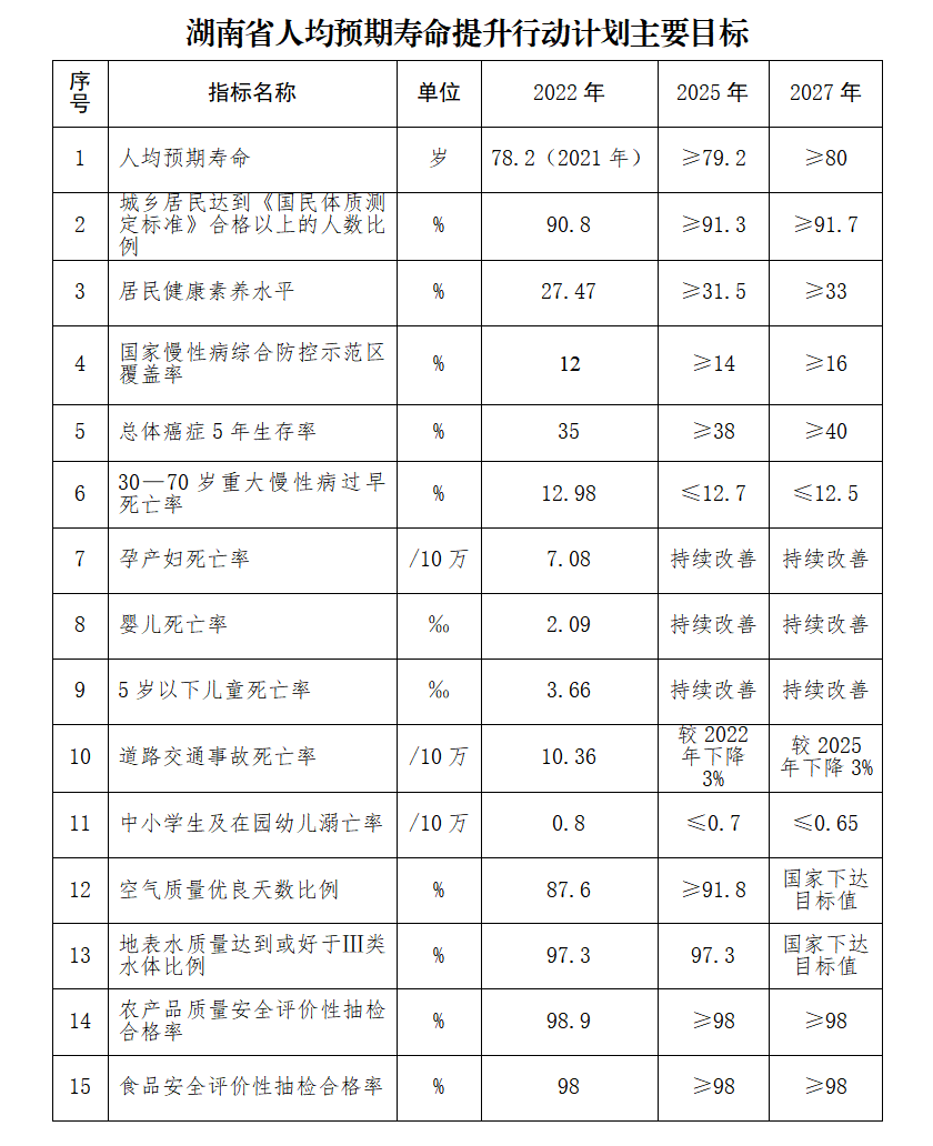 湖南省人民政府關(guān)于印發(fā)《湖南省人均預期壽命提升行動(dòng)計劃(2024—2027年)》的通知