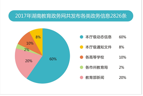截至2017年12月底,湖南教育政務(wù)網(wǎng)發(fā)布各類(lèi)政務(wù)信息共2826條,其中,廳委機關(guān)各處室、直屬各單位(不含直屬學(xué)校)共發(fā)布政務(wù)動(dòng)態(tài)信息1687條、各類(lèi)文件564個(gè),各高等學(xué)校共發(fā)布信息67條,各市州教育局共發(fā)布信息280條,教育部新聞228條。制作維護信息公開(kāi)專(zhuān)欄4個(gè);通過(guò)教育政務(wù)網(wǎng)“高校信息公開(kāi)”專(zhuān)欄公開(kāi)錄取信息12條,考生服務(wù)信息9條;納入省本級教育部門(mén)預算管理的高校均按要求在省政府網(wǎng)站、湖南教育政務(wù)網(wǎng)及學(xué)校網(wǎng)站公開(kāi)了2016年度部門(mén)決算和2017年度部門(mén)預算信息。