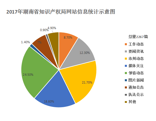 2、主動(dòng)報送、發(fā)布各類(lèi)政務(wù)信息。2017年,在國家知識產(chǎn)權局網(wǎng)站發(fā)稿94條,國家知識產(chǎn)權政務(wù)信息《知識產(chǎn)權工作動(dòng)態(tài)》發(fā)稿40條,向省政府辦公廳報送政務(wù)信息40余條,共采用20條,完成年度政務(wù)信息任務(wù)指標。在中國知識產(chǎn)權報、湖南日報、中國新聞網(wǎng)、紅網(wǎng)、湖南衛視、湖南經(jīng)視等報紙、網(wǎng)絡(luò )、電視媒體發(fā)稿500余篇。省局網(wǎng)站全年發(fā)布政務(wù)信息稿件超2200篇,其中工作動(dòng)態(tài)198篇,要聞資訊281篇,市縣動(dòng)態(tài)494篇,媒體關(guān)注423篇,通知公告160篇,執法公示22篇,機關(guān)黨建22篇。