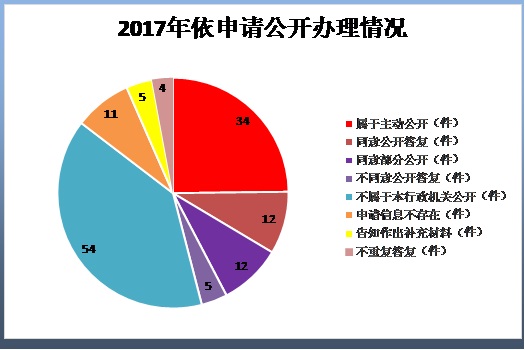 (二)辦理情況。2017年1月1日至12月31日,省食藥監局共受理公開(kāi)政府信息申請125件,依法按程序辦結125件。根據《中華人民共和國政府信息公開(kāi)條例》相關(guān)規定,在125件答復件中,屬于主動(dòng)公開(kāi)的34件,同意公開(kāi)答復12件,不同意公開(kāi)答復的5件(申請公開(kāi)的信息不是《條例》所指的政府信息),不屬于本行政機關(guān)公開(kāi)的54件,申請信息不存在的11件,告知作出補充材料的5件,不重復答復4件。按照申請人要求的形式回復分析,信函回復39件,網(wǎng)絡(luò )郵件回復32件,信函和網(wǎng)絡(luò )郵件同時(shí)回復52件,自行領(lǐng)取2件,分別占依申請公開(kāi)總量31.2%、25.6%、41.6%、1.6%。