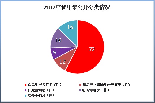 (一)受理情況。2017年1月1日至12月31日,湖南省食藥監局共收到政府信息公開(kāi)申請125件。按申請人居所分析,省內申請28件,省外申請97件,分別占依申請公開(kāi)總量22.4%、77.6%;按申請渠道分析,當面申請1件,信函申請50件,網(wǎng)絡(luò )郵件申請74件,分別占依申請公開(kāi)總量0.8%、40.0%、59.2%;從食藥監管業(yè)務(wù)類(lèi)別分析,食品生產(chǎn)經(jīng)營(yíng)類(lèi)72件,藥品、醫療器械生產(chǎn)經(jīng)營(yíng)類(lèi)12件,行政執法類(lèi)9件,投訴舉報類(lèi)16件,其他綜合類(lèi)信息16件,分別占依申請政府信息總量的57.6%、9.6%、7.2%、12.8%、12.8%。數據顯示:2017年依申請公開(kāi)省外多于省內;網(wǎng)絡(luò )郵件已經(jīng)超過(guò)信函申請,成為依申請公開(kāi)的快捷道;食品生產(chǎn)類(lèi)信息依申請公開(kāi)占大多數,且呈上升趨勢。